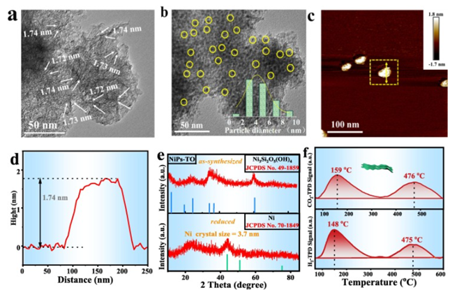 (二)在微波合成过程中加入表面活性剂CTAB显著降低了片层厚度,成功制得片层仅为1.43 nm的页硅酸镍。在常压、400 oC、60 L·g−1·h−1时,该催化剂的CO2转化率为81.7%,TOFCO2(220 oC)高达5.4 ± 0.1 × 10−2 s−1,Ea低至80.74 kJ·mol−1,各项关键指标均优于已报道催化剂。研究发现,微波合成较短的反应时间导致片层不会过度生长,同时加入表面活性剂后产生的气泡可作为模板限制页硅酸镍的生长,最终得到超薄页硅酸镍,显著提升了催化性能。