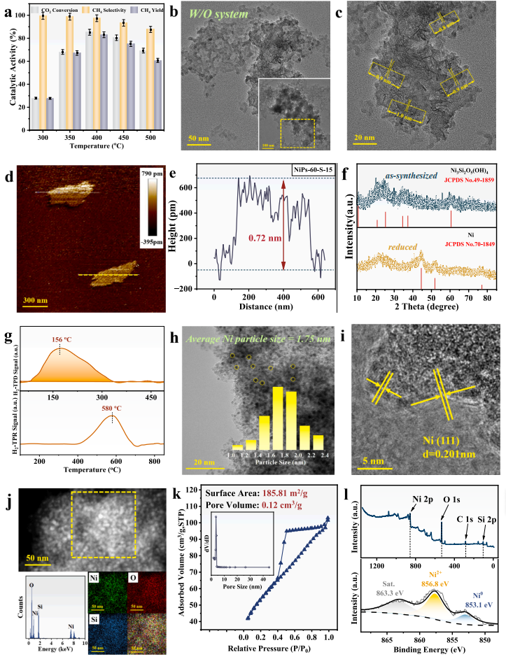 众所周知,乳化系统的微滴在搅拌下不断变化,形成新的界面。这不仅显著增加了页硅酸镍的生长位置,还缩短了特定位置的稳定生长时间。此外,正庚烷和油胺的稀释作用降低了中间体的浓度。因此,在动态乳化系统中,不稳定界面增加、中间体浓度降低以及避免不均匀生长的综合作用协同制备了超薄页硅酸镍。在形态方面,NiPs-60-S-15表现出更严重的破碎,厚度在0.7 nm左右的纳米片在NiPs-60-S-15上密集分布。性能方面NiPs-60-S-15催化剂在400 °C、60 L·g−1·h−1、0.1 MPa下表现出85.23%的竞争性CO2转化率,具有较高的TOFCO2(3.6×10–2 S–1)和低活化能(66.60 kJ·mol–1)。
