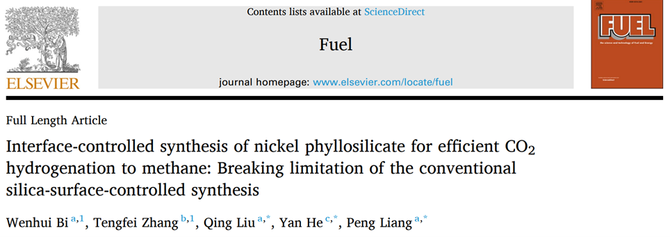 文章信息:Wenhui Bi, Tengfei Zhang, Qing Liu(刘庆)*, Yan He*, Peng Liang(梁鹏)*,Interface-controlled synthesis of nickel phyllosilicate for efficient CO2 hydrogenation to methane: Breaking limitation of the conventional silica-surface-controlled synthesis, Fuel, 2025, 380, 133131.