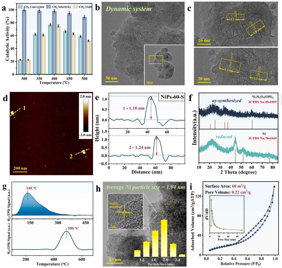 为了构建更多的液-液相界面,本研究提出了动态搅拌辅助界面合成。与静态合成不同,很难获得更大面积的页硅酸镍,但微观形态上能观察到大量属于页硅酸镍的纳米片,厚度约为1.1 nm。这是由于搅拌构建了不稳定的反应界面,限制了反应程度,搅拌产生的剪切力使页硅酸镍片层剥落。NiPs-60-S显示出更加优异的催化性能,在400 °C下CO2转化率最高为76.73%,CH4选择性为97.89%,CH4收率为75.11%。