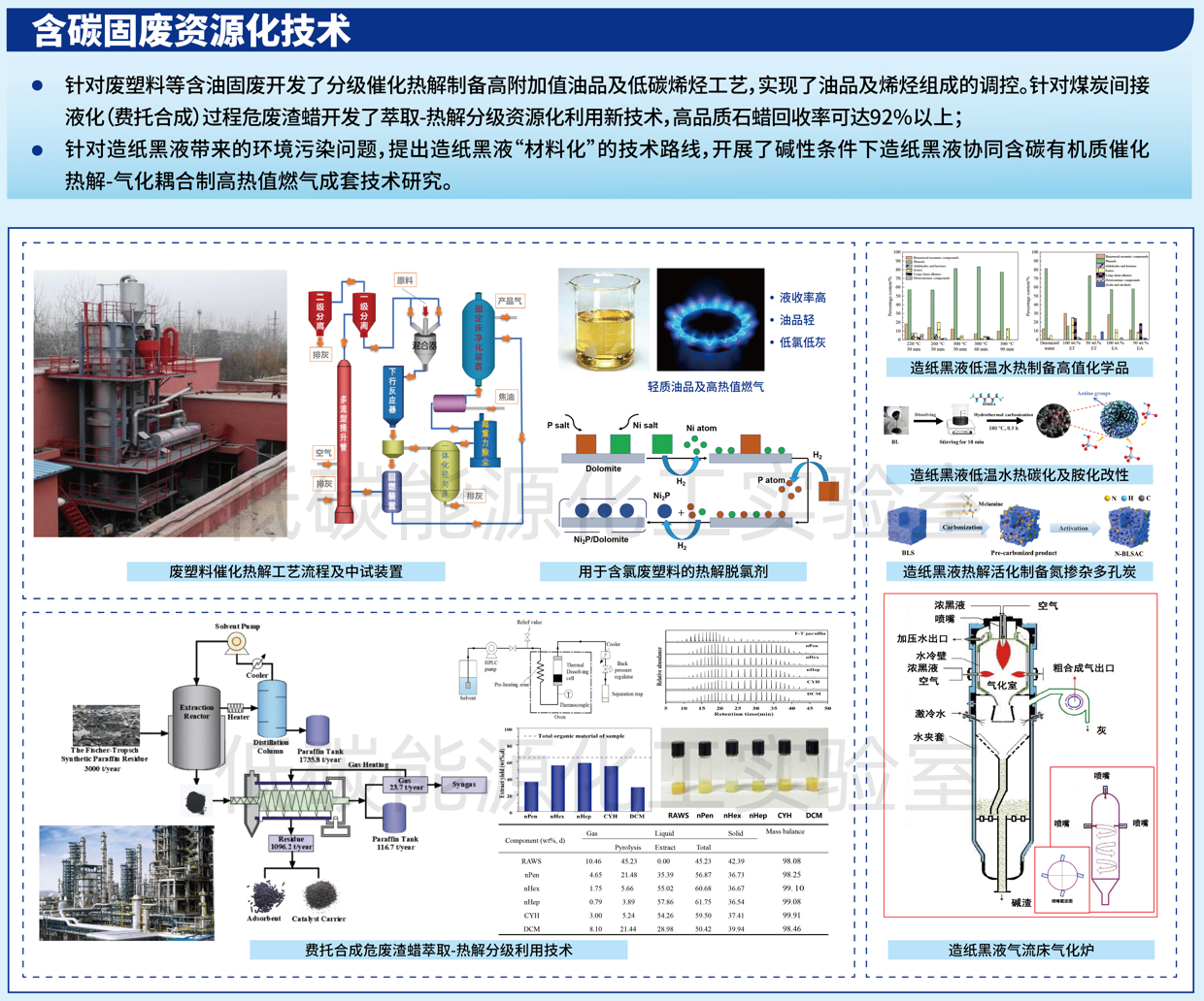 固体废弃物资源化利用新技术的开发是我国实现“双碳”目标的关键,实验室确立了含碳固废资源化技术研究方向,针对不同有机固废处置过程存在的瓶颈问题,通过材料-设备-工艺”贯通式研发,实现固废的减量化和资源化,开发了针对不同含碳有机固废的分级热解多联产技术及相关装备。